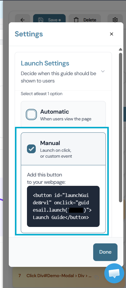 In the GuideSail Builder, open the guide's Settings (gear icon on the top right) and set Launch Settings to Manual.