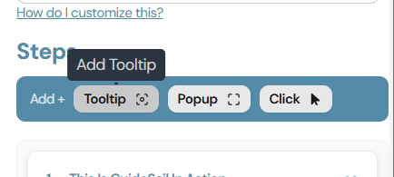 Tip: Place a Click step before a Tooltip that points to something inside a menu or modal. The Click step will open the menu first, then the Tooltip will highlight the target element.
