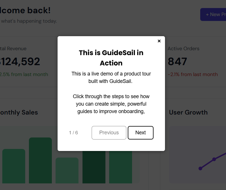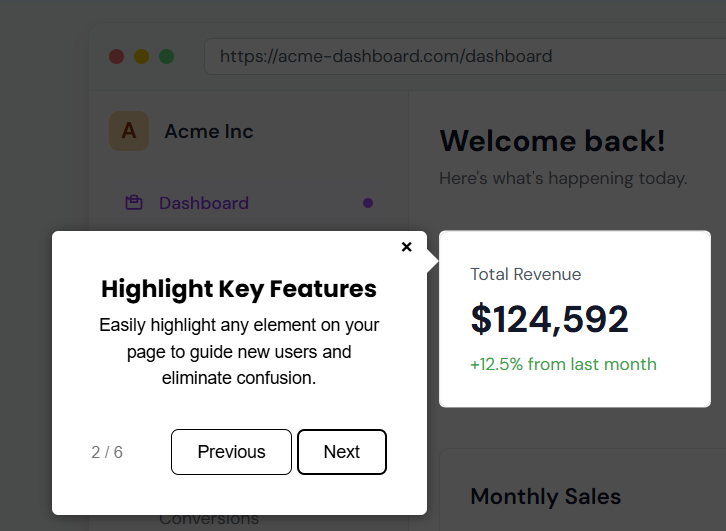 Best for: Pointing out a specific button, field, or section of your UI. Walking users through a flow step-by-step.